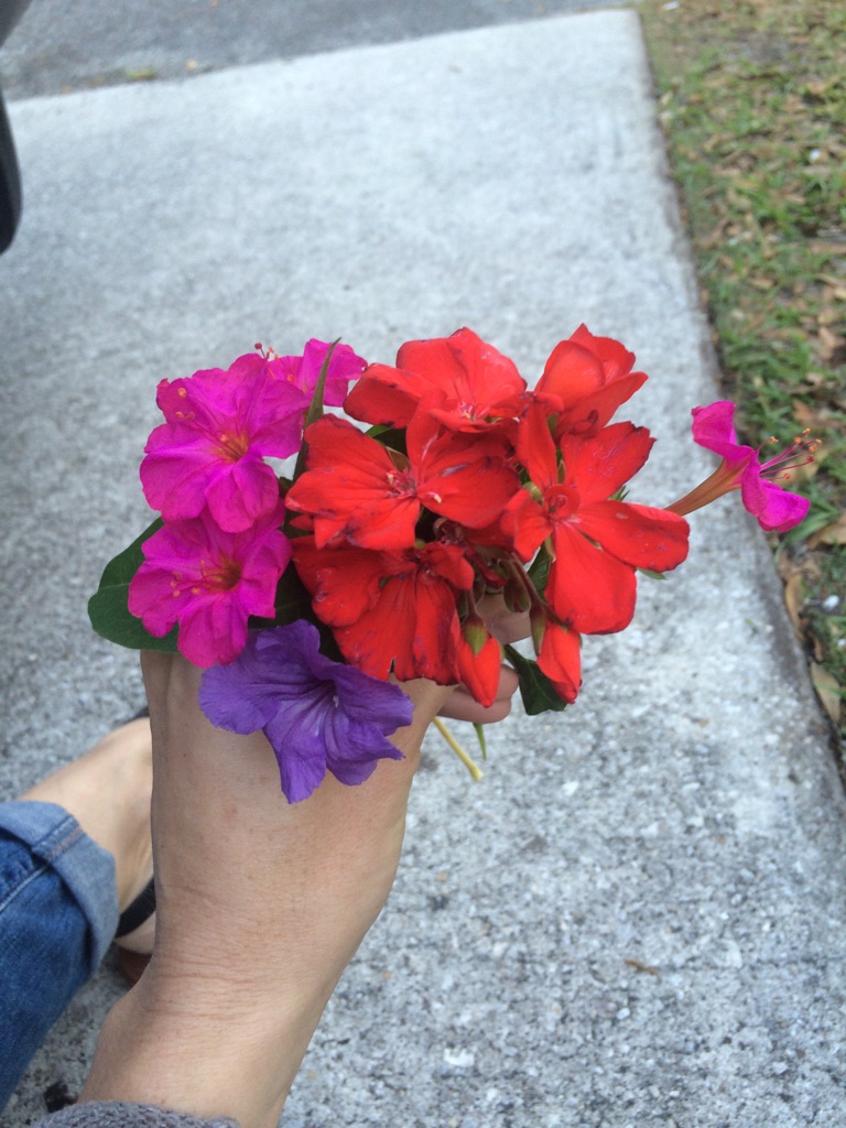 In my world there is a little homeless Asian lady who walks the neighborhood (who should never be hungry again, or be without adequate clothing, shoes or blankets because everyone in our area knows that she’s there), there’s the black man who walks up and down McDuff St. speaking gibberish, so everyone thinks that he’s lost his marbles (and who knows, maybe he has), there’s the white man who lives in a tent in Lackawanna (who turns to drugs every chance he gets because relationships have failed him), there’s the old man who rides his bike all over the city yelling as if he is pissed off at the world because he suffers from PTSD, then there’s the young man standing outside of CVS in Boulder Colorado for hours in the snowy weather probably just needing a real friend (not just a temporary conversation but a life long connection), there are the men and women sleeping in the streets of Asheville, NC in front of almost every shop downtown (every time you go for a visit to the mountains they are there), then there is the neighbor “Bobby” that walks up and hands me these flowers as I sit on the side of the road writing this blog.